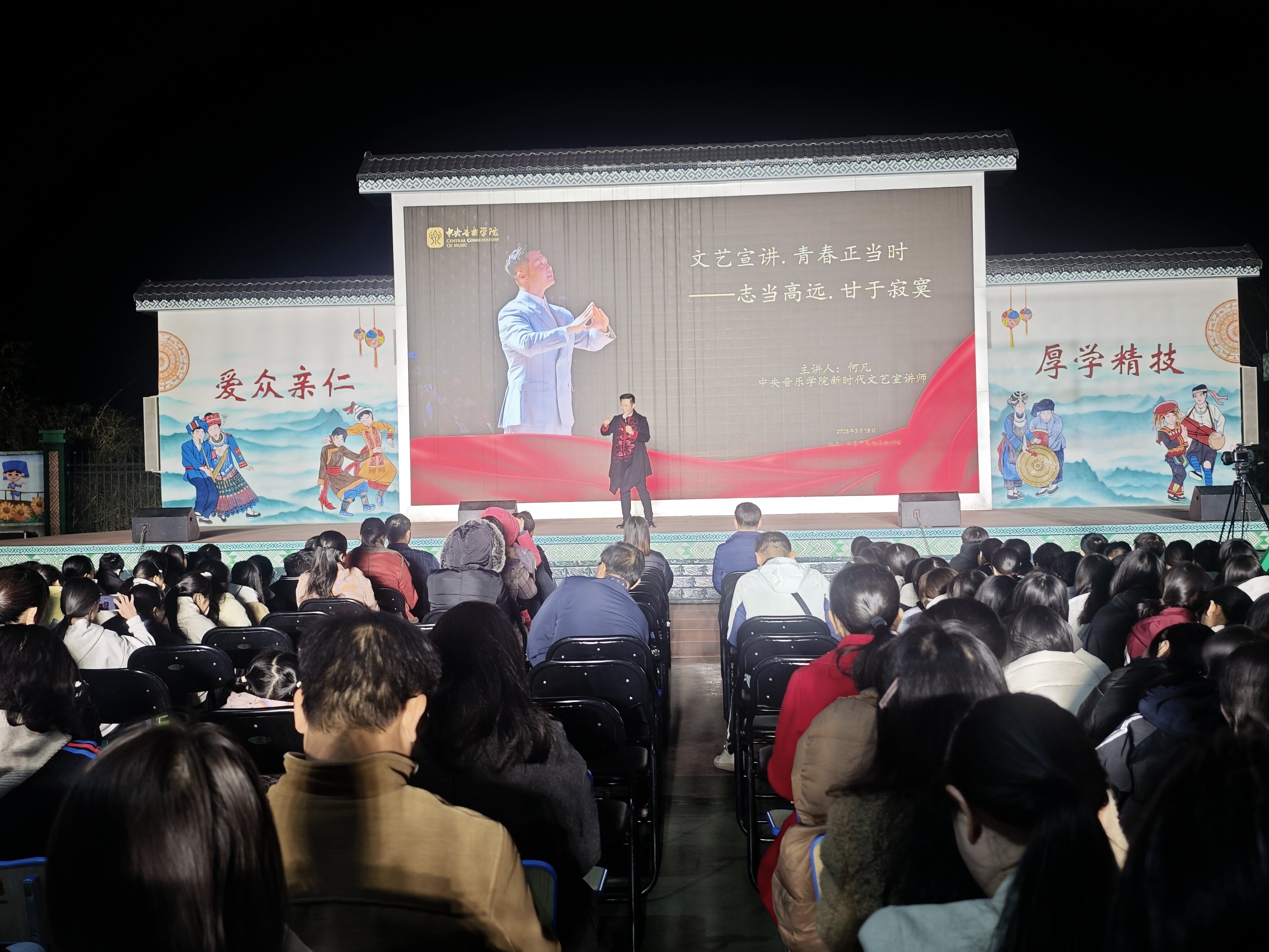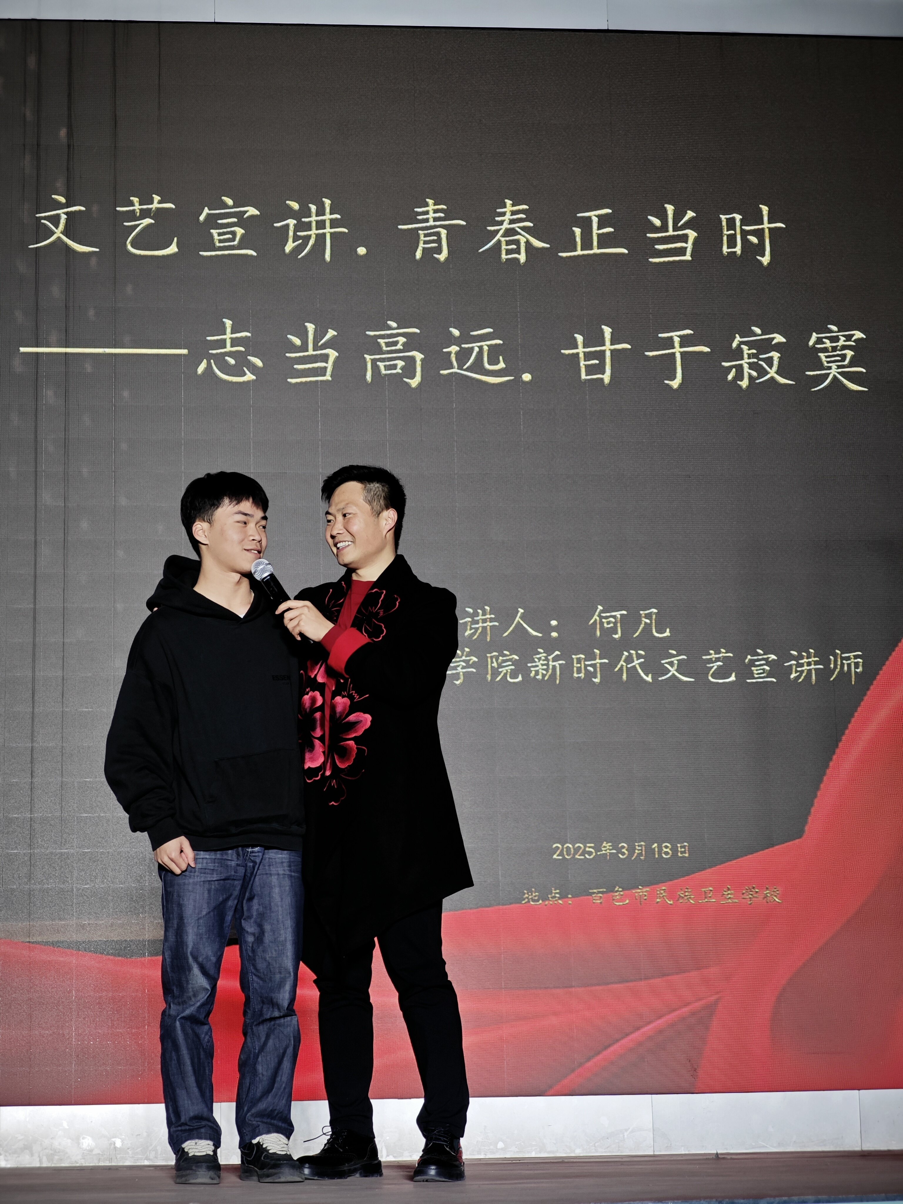 3月18日晚,中央音乐学院派驻百色市新时代文艺宣讲师何凡走进百色市民族卫生学校,以“志当高远 甘于寂寞”为主题,为全校师生带来一场别开生面的音乐文艺宣讲活动。此次活动旨在通过艺术与教育的深度融合,引导青年学子树立远大理想,培养坚韧品格,并积极践行社会责任。